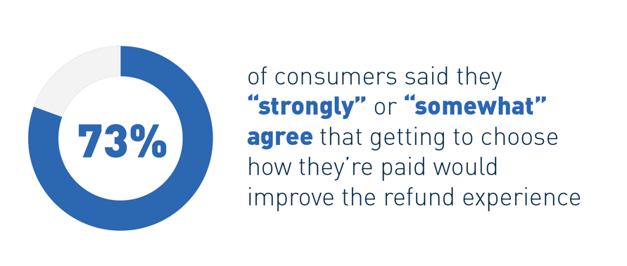 When it comes to refunds, the majority of customers say they didn’t receive a choice of payment methods, at all. Yet, 73% of consumers said they “strongly” or “somewhat” agree that getting to choose how they’re paid would improve the refund experience.