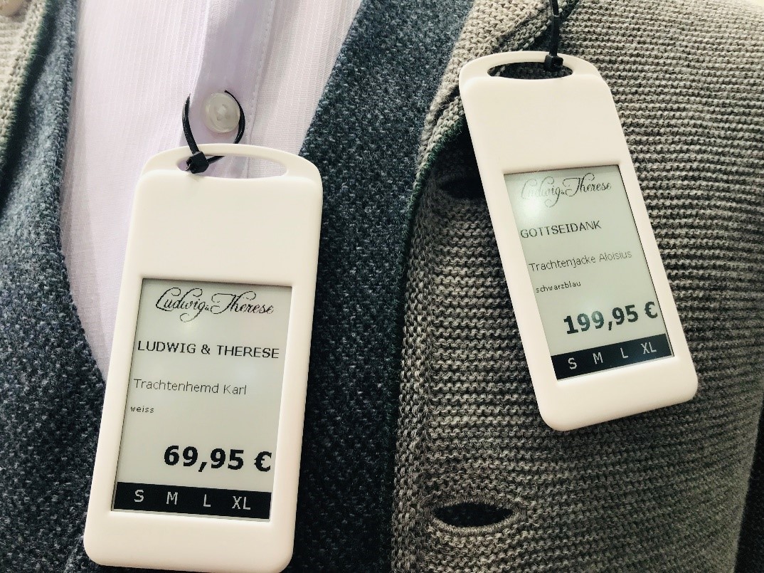 A very interesting variant of ESLs for fashion houses are the so-called “Fashion Tags” which can be used instead of conventional article surveillance labels. They are attached directly to clothing and in addition to article surveillance, they offer customers the possibility to pay directly, receive further information via smartphone such as alternative colors and sizes or even to reserve a garment.