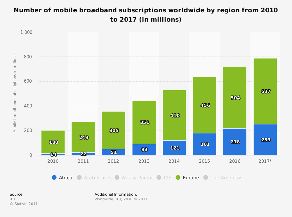 In 2017, 253mn Africans had access to mobile broadband coverage – that’s an 18-fold increase from 2010! Compare it to Europe: Since 2010, the number of mobile broadband accounts “only” increased three-fold, from 188mn to 537mn.