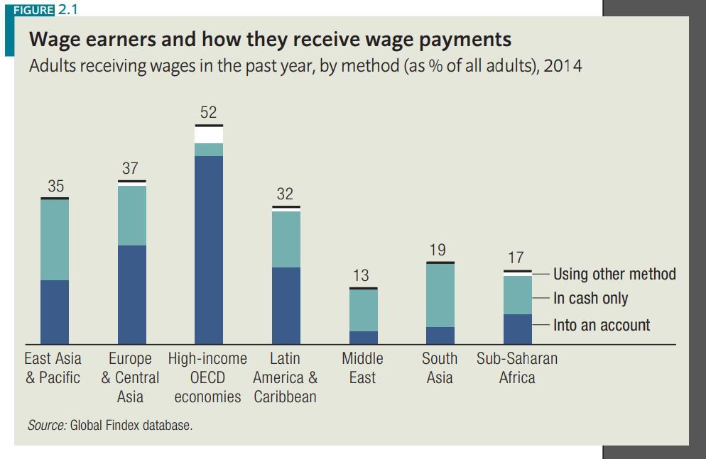 It starts with how wages are earned. If you exclude the high-income OECDs, on average, nearly 50% of the world’s population still receive their wages in cash: