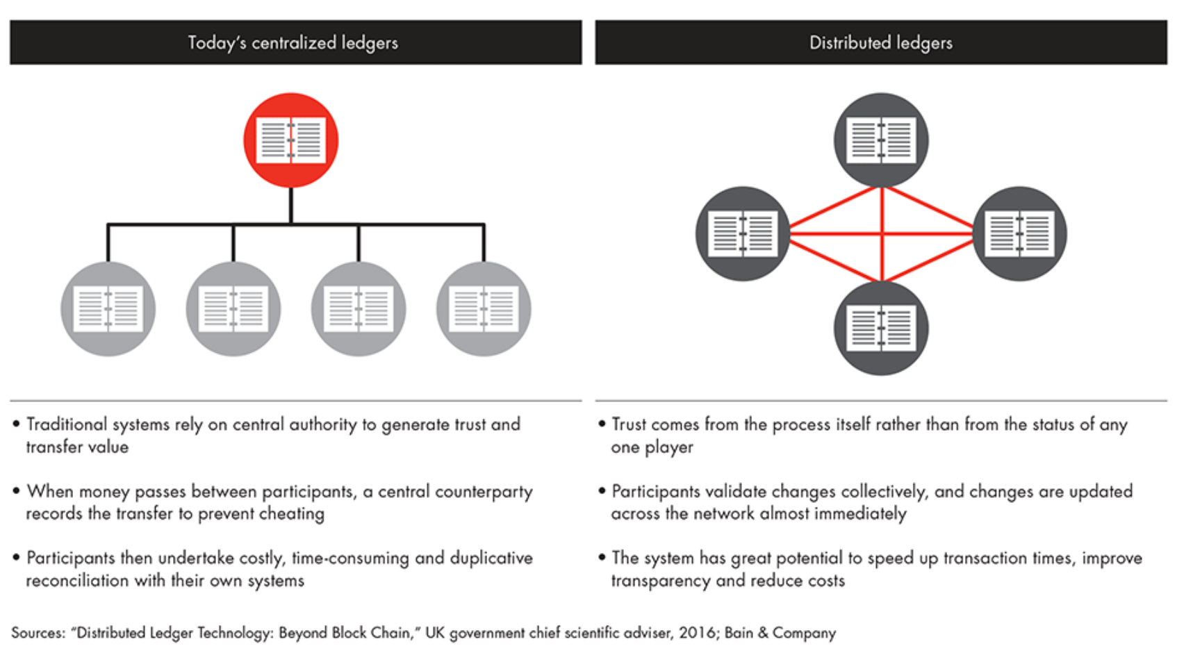 How payment systems used to work – and how they will increasingly work in the future, thanks to distributed (instead of centralized) ledgers (Source: Bain & Company)