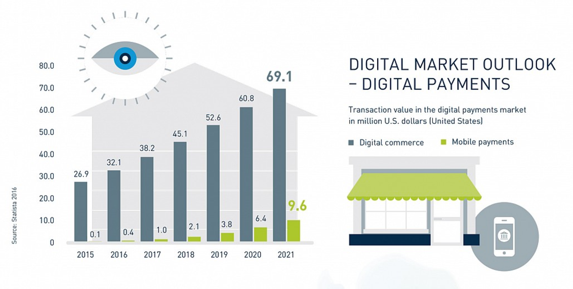 From 2015 to 2021, digital commerce is expected to grow with a remarkable compound annual growth rate (CAGR) of 14.4 percent.