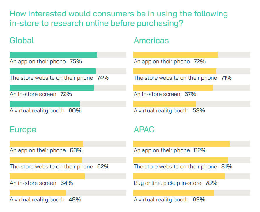 Consumers are interested in using technology to research products while they are in-store, blurring the lines between the physical and online shop. 74% said they are interested in using an app or the store’s mobile website to research more about the product they are looking at, while at least 72% said they have some interest in using in-store technology like tablets, and 60% are interested in using VR.